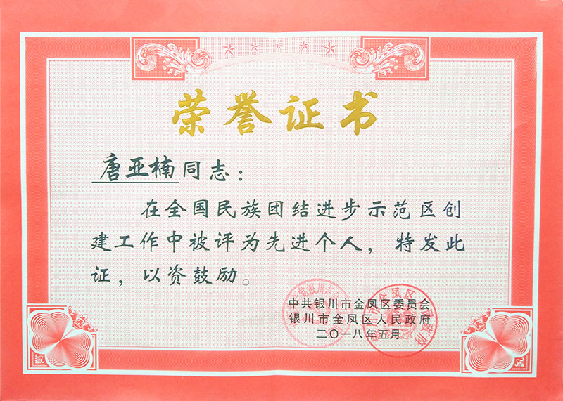 唐亞楠被評(píng)為全國(guó)民族團(tuán)結(jié)進(jìn)步示范區(qū)創(chuàng)建工作先進(jìn)個(gè)人