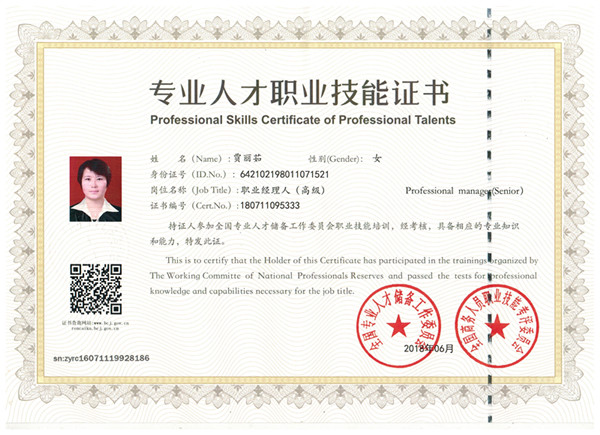 銀川伊百盛生物工程有限公司行政部經理賈麗茹榮獲“專業人才職業技能證書”