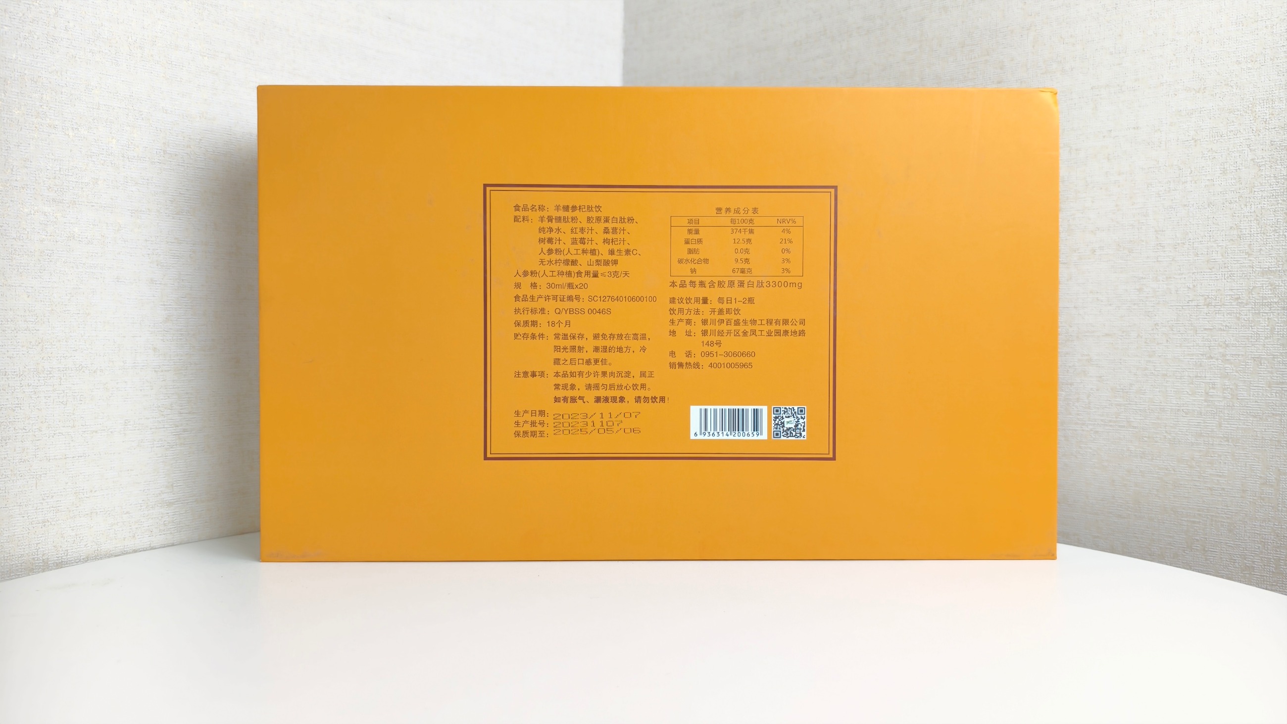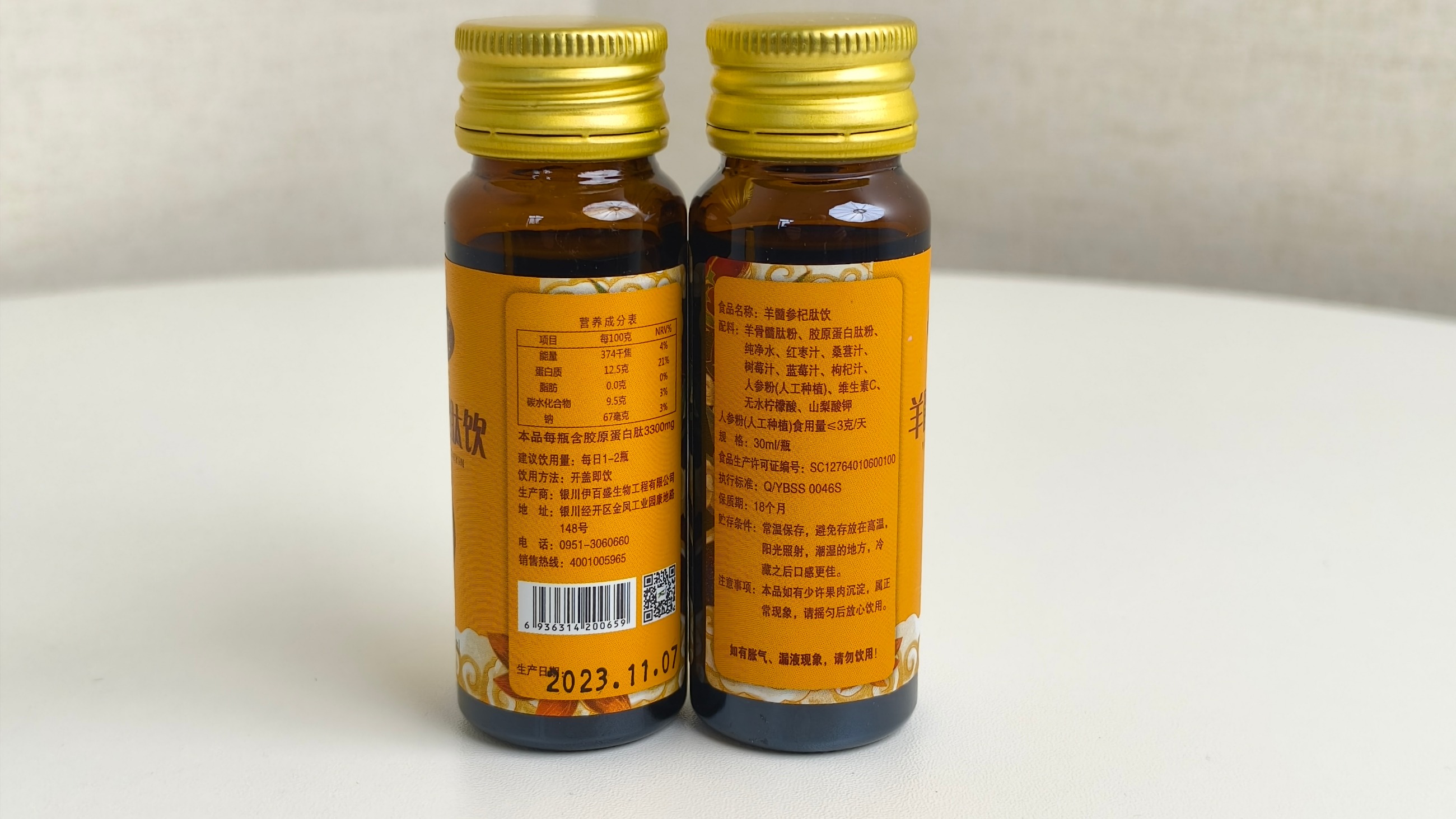 配料: 羊骨髓肽粉、膠原蛋白肽粉、純凈水、紅棗汁、桑甚汁、樹莓汁、藍莓汁、枸杞汁、人參粉(人工種植)、維生素C、無水檸檬酸、山梨酸鉀